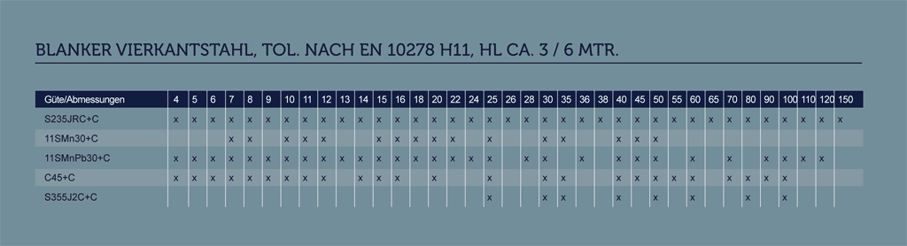 - Blanker Vierkantstahl, Tol. nach EN 10278 h11, HL ca. 3 / 6 mtr.
