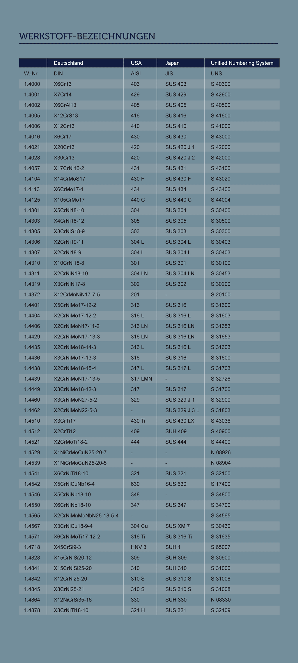 1.4301, 1.4306, 1.4541, 1.4404, 1.4539, 1.4571, 1.4462, 1.4828, 1.4841